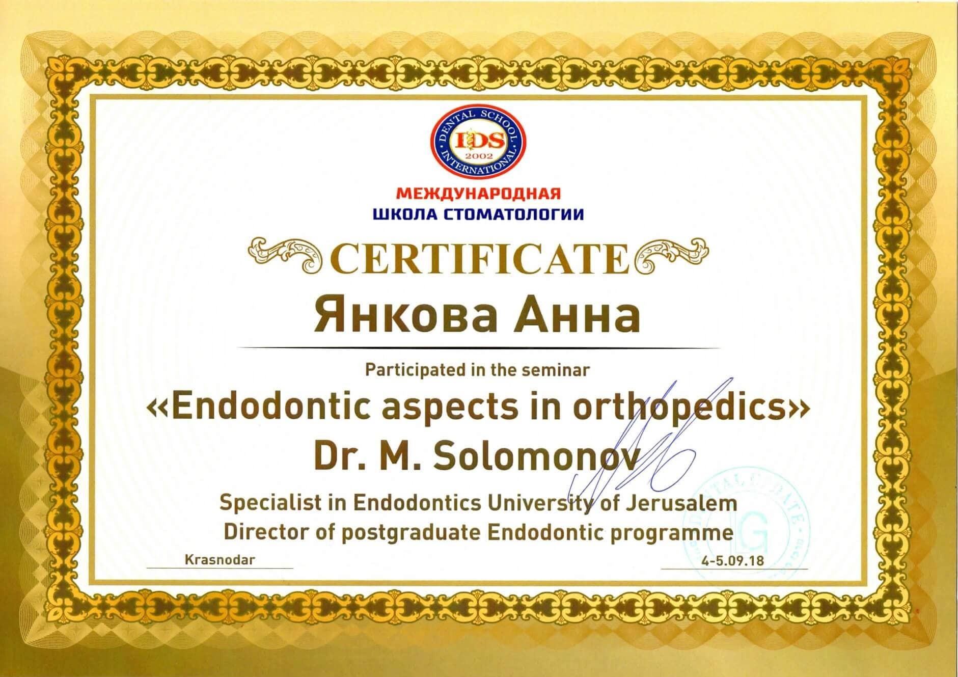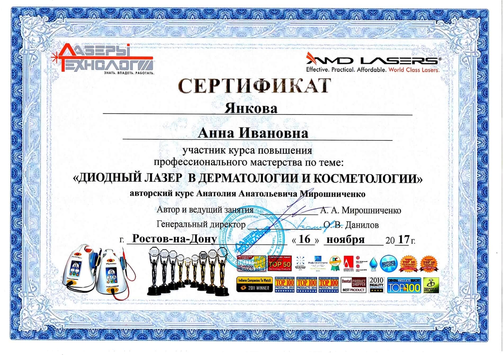 Прошла профессиональную переподготовку в НОУ ДПО «Институт повышения квалификации» г. Ростова-на-Дону по стоматологии ортопедической от 24.12.2015г.